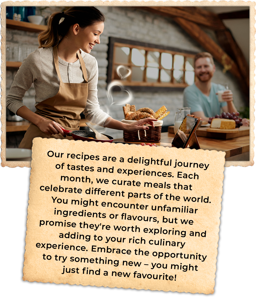 Our recipes are a delightful journey of tastes and experiences. Each month, we curate meals that celebrate different parts of the world. You might encounter unfamiliar ingredients or flavours, but we promise they're worth exploring and adding to your rich culinary experience. Embrace the opportunity to try something new – you might just find a new favourite!