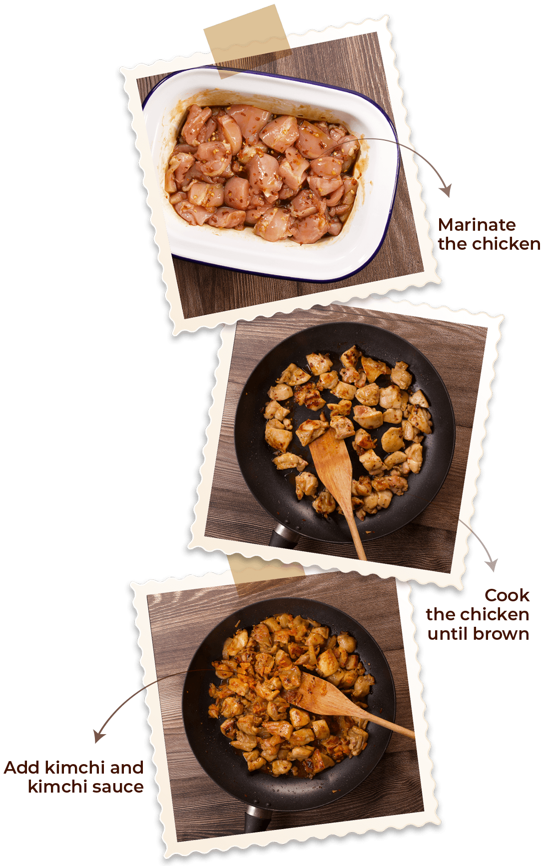 In a bowl, combine the chicken pieces with kimchi sauce and chilli flakes. Allow it to marinate for at least 30 minutes in the refrigerator.